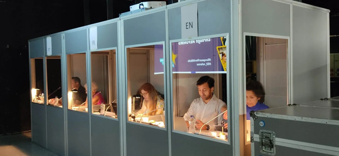 Raramente fazemos cabines puras (só com uma língua). Porém, neste caso, o cliente pediu-nos que fizéssemos. Tivemos então, no local, 6 intérpretes, 3 cabines, receptores e auriculares e emissores de infravermelhos.
